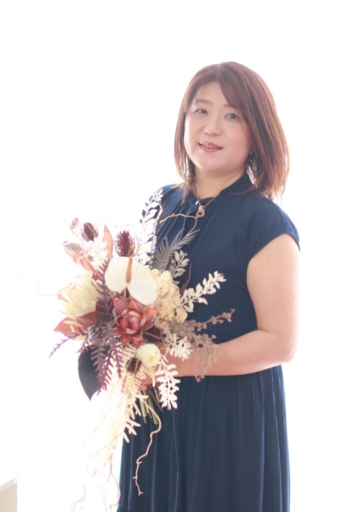 そして、長男が結婚するというタイミングでウェディングブーケを作ってみたい!という思いが強くなり、TAAで販売学のディプロマを取得致しました。さらに講師学のディプロマを取得し、現在に至ります。